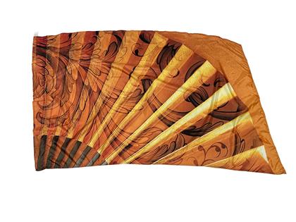 Digitally screen printed polysilk with yellow, orange, and brown feather fan design.