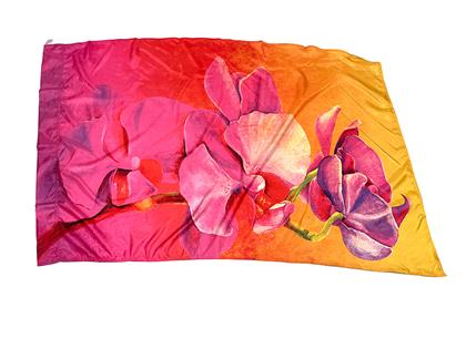 Digitally screen printed polysilk with shades of re and pink flower design.