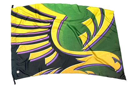 Digitally screen printed polysilk with black, purple, yellow, and green abstract design.