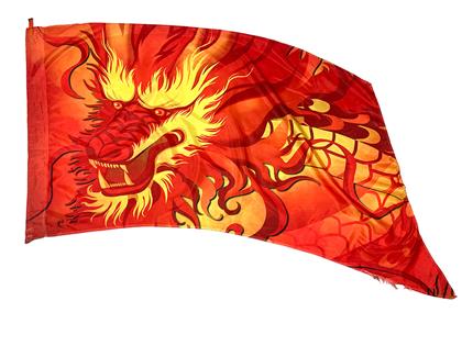 Digitally screen printed polysilk with yellow, orange, and red dragon design.