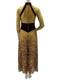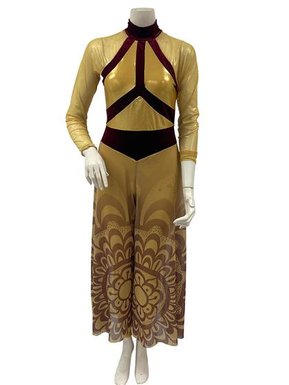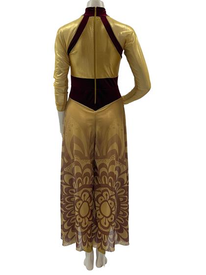 Long sleeved unitard with gold foil dot and maroon velvet top, gold sheer sleeves, and digitally screen printed skirt. Professionally Made by Fred J Miller, Inc.