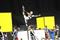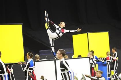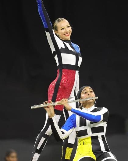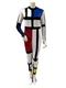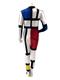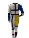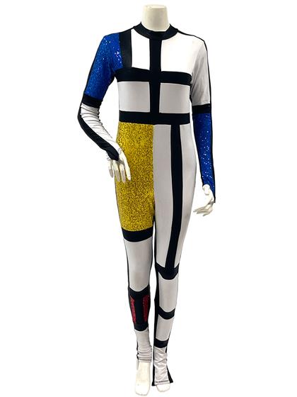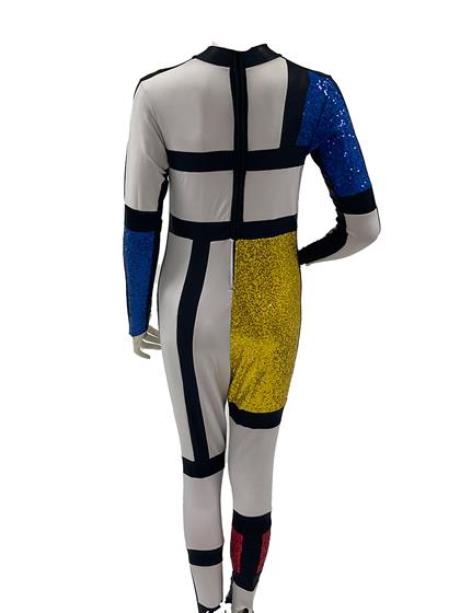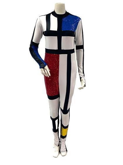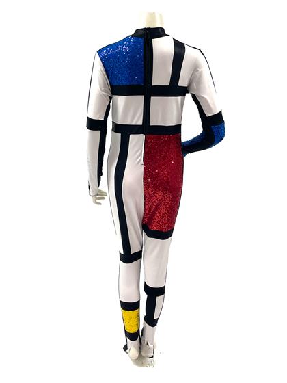 Digitally screen printed backzip unitard with Mondrian style color block design. White base, black stripes and red, yellow, and blue string sequin assorted blocks. All are slightly different. Professionally Made by Dance Sophisticates. Used with UNI-4421B/D.