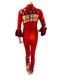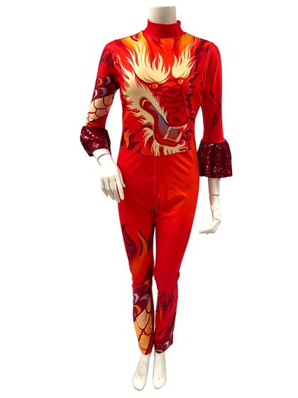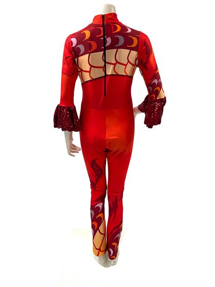 Digitally screen printed lycra unitard with red sequin frilly sleeves. Legs designed to go into shoes.