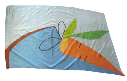 Carrot on a string: Blue(s), Brown, Orange, Green and Yellow Polysilk with some hand-drawn detail.