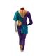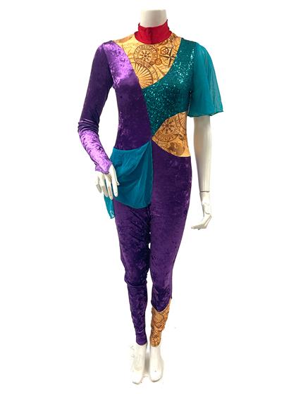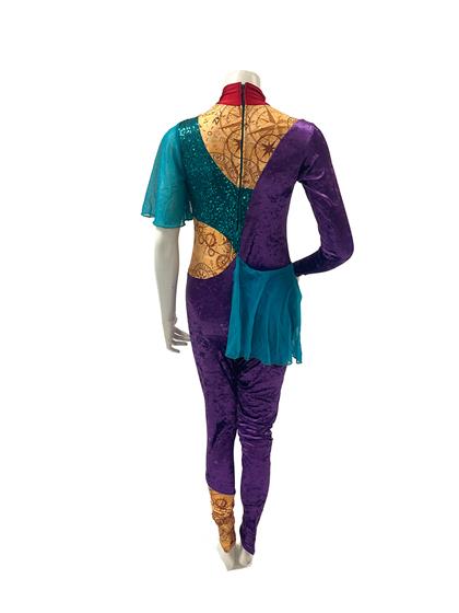 Back zip unitard with purple panne velvet, emerald sequin and mesh. and digitally screen printed lycra with abstract compass design. Red lycra collar. Professionally Made by Dance Sophisticates.